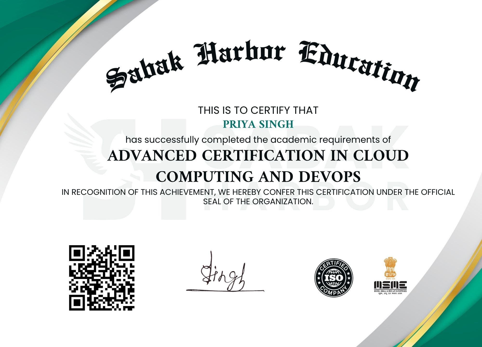 Sabak Harbor’s Advanced Certification in Cloud Computing and DevOps is designed to prepare learners for high-demand roles in modern IT infrastructure and automation. Through a perfect blend of real-world projects, hands-on labs, and expert mentorship, the program helps participants gain end-to-end expertise in cloud platforms, DevOps tools, and CI/CD pipelines.