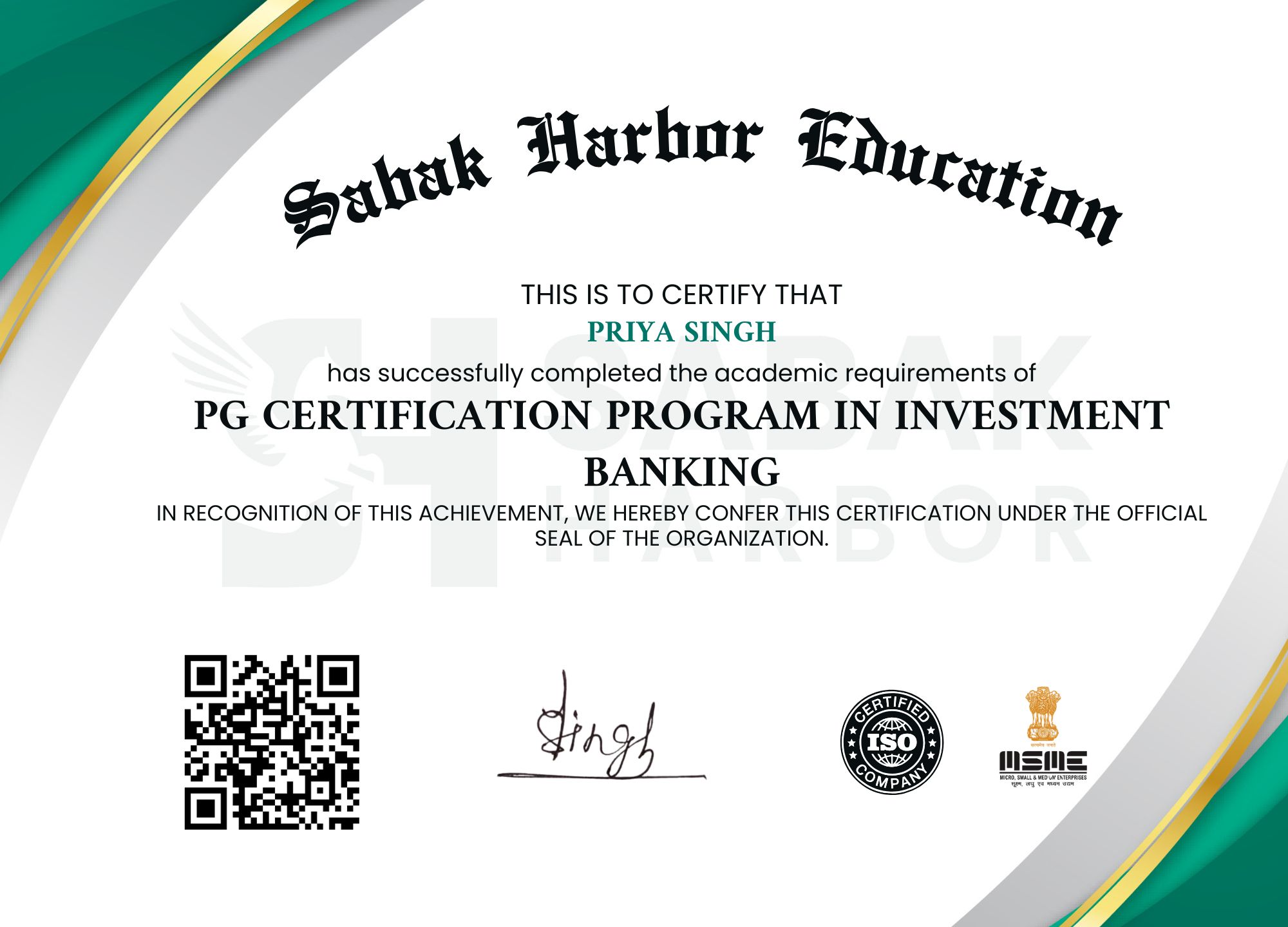 Sabak Harbor’s Post Graduate Certification Program in Investment Banking is designed to prepare ambitious finance professionals with the expertise required to succeed in the highly competitive world of global banking and capital markets. Through practical training, case studies, and expert mentorship, the program bridges the gap between academic learning and the real-world demands of investment banking. Tailored for fresh graduates and early-career professionals (0–3 years of experience), this program builds solid foundations in financial markets, corporate finance, and investment banking operations while sharpening analytical and decision-making skills.